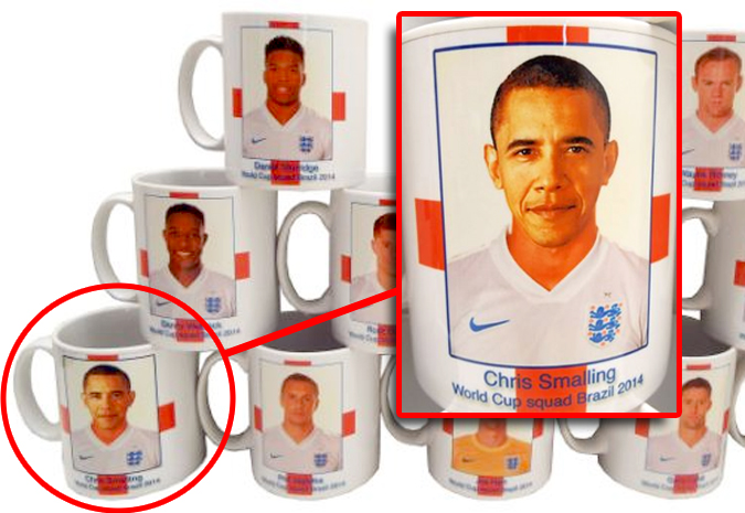 Kumpanija li tipproduċi prodotti għall-merchandising għamlet dik li ħafna qed isejjħulha bħala l-“Gaffe tat-Tazza tad-Dinja 2014″. Dan hekk kif wieħed mill-mugs li l-kumpanija għamlet bl-uċuh tal-plejers fl-iskwadra nazzjonali Ingliża, minflok, għandu wiċċ il-President Amerikan Barack Obama. Naturalment, dan sar bi żball għax ir-ritratt ta’ Obama ntuża’ minflok dak tad-difensur Ingliż Chris Smalling.