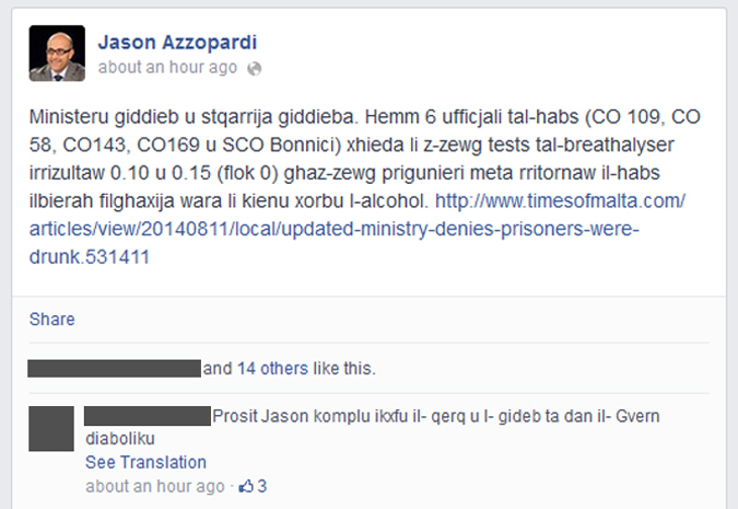Wara din iċ-ċaħda mill-Ministeru ta’ Manwel Mallia, Jason Azzopardi reġa’ kiteb fuq Facebook (ritratt isfel) u qal li l-Ministeru gideb meta qal li t-testijiet li saru fuq il-priġunieri rriżultaw fin-negattiv. Il-Kelliem tal-Oppożizzjoni qal li hemm sitt Uffiċjali tal-Ħabs li huma xhieda li miż-żewġ testijiet tal-breathalyser irriżulta li l-priġunieri kienu fil-fatt ikkunsmaw l-alkoħol.