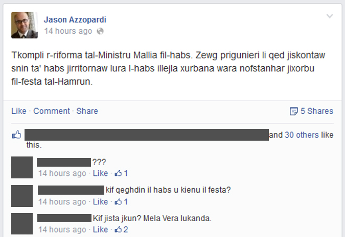 Żewġ priġunieri li qed jiskontaw sentenzi ta’ ħabs ilbieraħ filgħaxija rritornaw il-Ħabs fis-sakra wara sigħat twal jixorbu waqt il-Festa ta’ San Gejtanu fil-Ħamrun. Din l-informazzjoni ġiet żvelata mill-Kelliem tal-Oppożizzjoni għall-Intern u s-Sigurtà Nazzjonali Jason Azzopardi, li fuq Facebook (ritratt fuq) ikkritika lill-Gvern għas-suppost ‘Riforma fil-Ħabs’ li qed jagħmel.