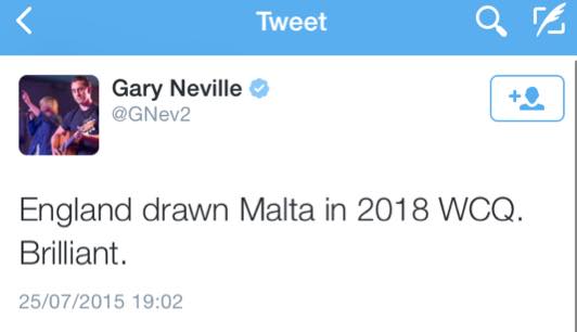 Il-plejer internazzjonali tal-Ingilterra Gary Neville ċċelebra l-fatt li l-Ingilterra ġiet fl-istess grupp ta’ Malta, Grupp F, għall-fażi ta’ kwalifikazzjoni għat-Tazza tad-Dinja 2018.