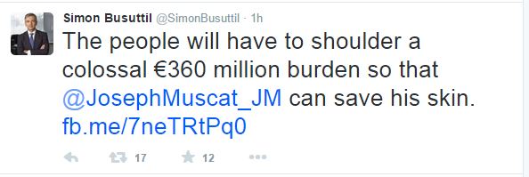 L-Oppożizzjoni tfakkar li l-Gvern mgħandu l-ebda mandat elettorali biex ipoġġi piż kolossali ta’ €360 miljun fuq il-poplu Malti. Huwa ċar li l-uniku raġuni għal dan il-piż fuq il-poplu Malti huwa li Joseph Muscat jiprova jsalva ġildu.