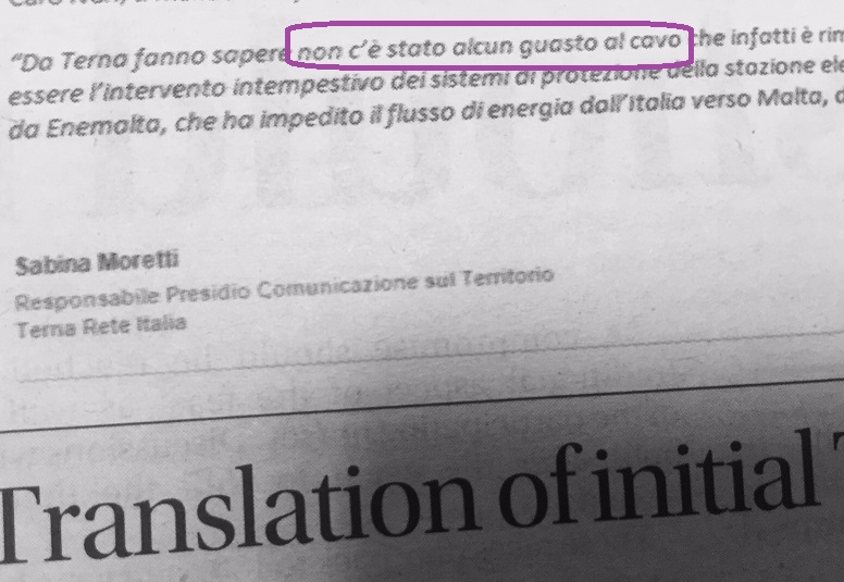 Iżda korrispondenza mal-istess Moretti, f’isem il-kumpanija fi Sqallija li tħaddem l-interconnector, tikkonferma li meta kellna il-blackout fis-6 t’Awwissu minn naħa ta’ Terna ma kien hemm l-ebda ħsara fil-cable, u s-servizz tal-elettriku baqa’ għaddej. Din hija konferma oħra l-ħsara kienet minn naħa tal-Istazzjon fil-Magħtab, kif tispjega l-kelliema ta’ Terna fl-email tagħha.