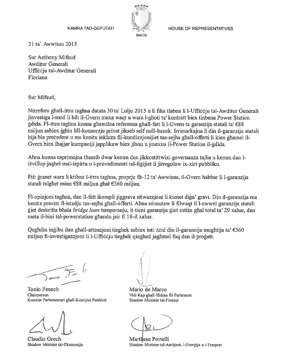 Agħfas hawn biex tara kopja tal-ittra mibgħuta lill-Awditur Ġenerali.