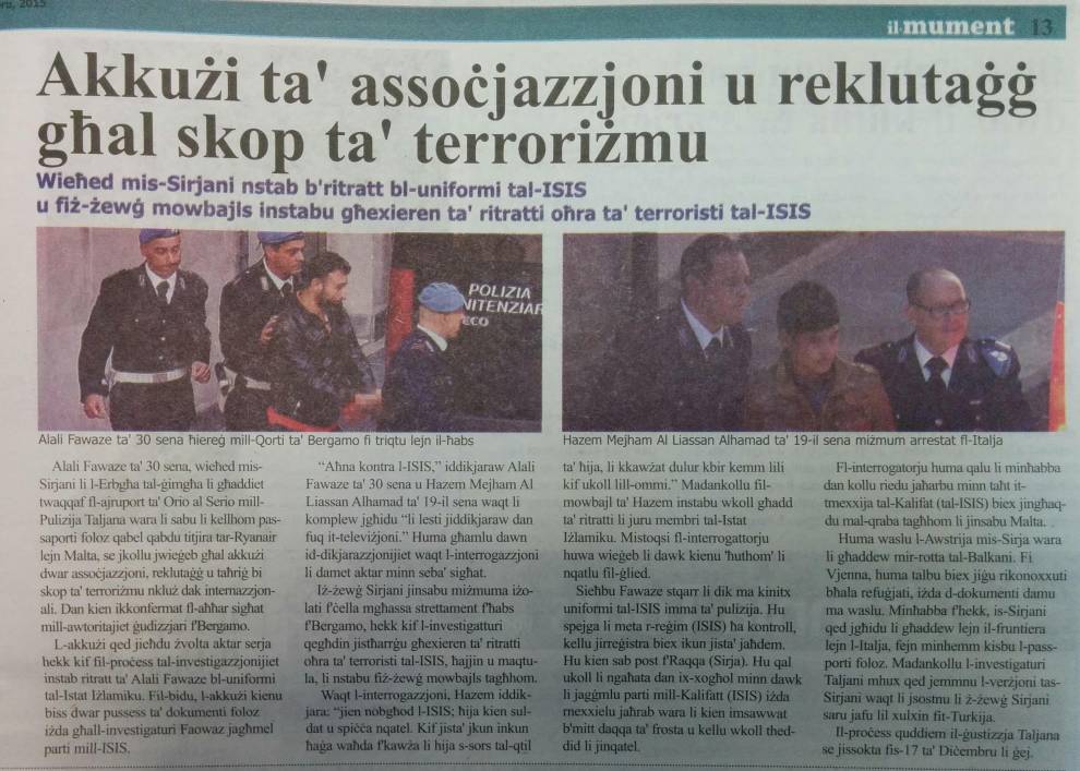 Il-gazzetta il-mument tgħid li s-Sirjan li kien arrestat b’passaport falz fi triqtu lejn Malta minn Bergamo, kien akkużat formalment li hu membru tal-grupp terroristiku internazzjonali – l-ISIS.