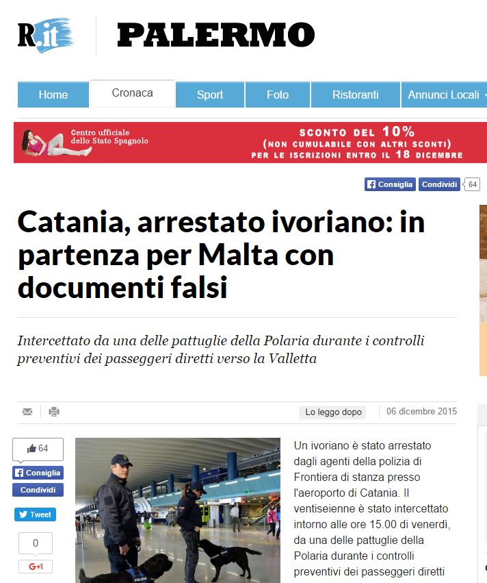 Raġel ta’ 27 sena mill-Kosta tal-Ivorju kien arrestat fl-ajurport ta’ Katanja fi Sqallija wara li nqabad li kellu dokumenti foloz. Ir-raġel kien fi triqtu lejn Malta.