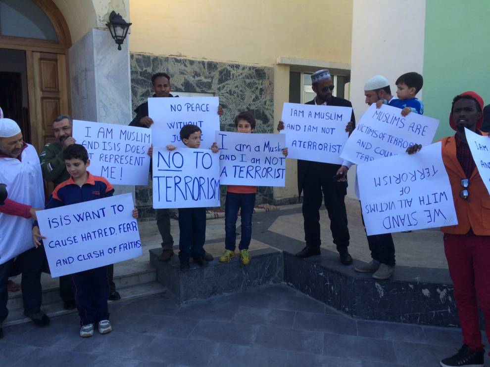 Meta kien qed jindirizza d-dimostrazzjoni, l-Imam qal li t-terrur m’għandux fruntieri jew reliġjonijiet u li t-terroristi huma qabel xejn għedewwa tal-Islam u l-Musulmani, peress li dawn jabbużaw il-fidi Musulmana filwaqt li jkissru r-reputazzjoni tal-Musulmani kollha madwar id-dinja.