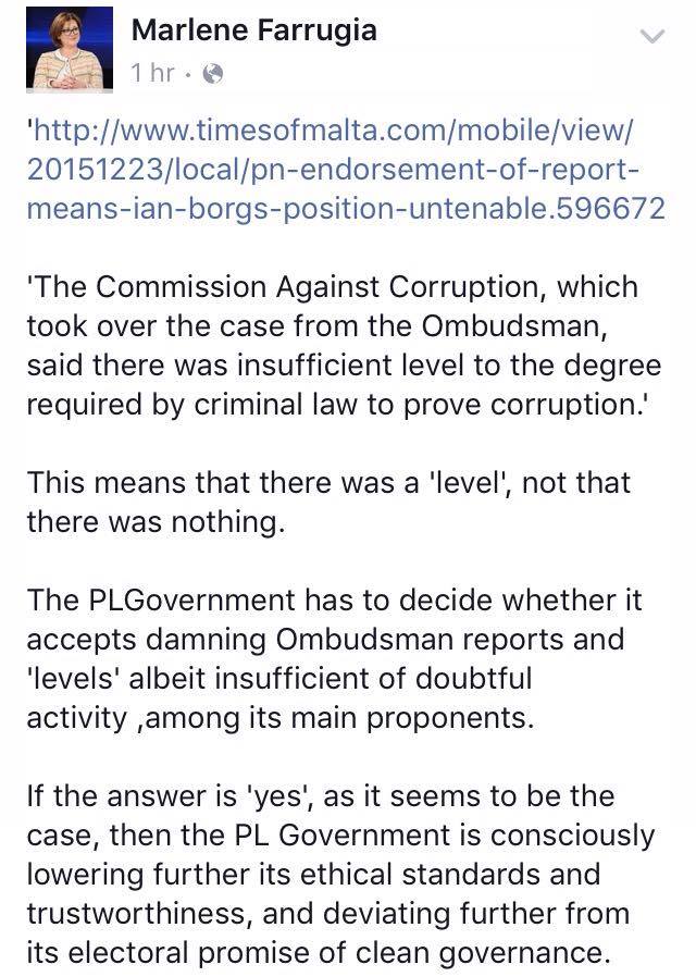 Fil-post tagħha fuq Facebook, Marlene Farrugia qalet li l-Gvern Laburista għandu jiddeċiedi jekk hux se jaċċetta r-rapport tal-Ombudsman u l-konklużjoni tal-Kummissjoni Kontra l-Korruzzjoni li ma kinex hemm “livell biżżejjed” – jiġifieri li kien hemm xorta waħda xi tip ta’ livell ta’ provi.