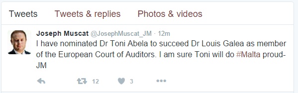In-Nomina ta’ Abela thabbret permezz ta’ tweet mill-Prim Ministru Joseph Muscat.