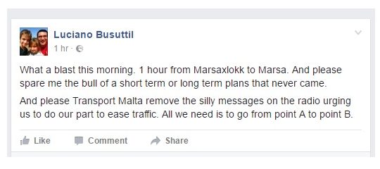 Il-frustrazzjoni tas-sewwieqa tal-karozzi lejn il-Ministru Joe Mizzi esprimiha ukoll id-deputat Laburista Luciano Busuttil illi fuq Facebook spjega kif dalgħodu għamel siegħa sħiħa fit-traffiku.
