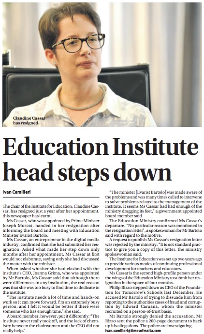 Fil-gazzetta Times of Malta tħabbar li ċ-Chairperson tal-Istitut għall-Edukazzjoni Claudine Cassar irriżenjat sena wara li kienet inħatret fil-kariga mill-Prim Ministru Joseph Muscat.