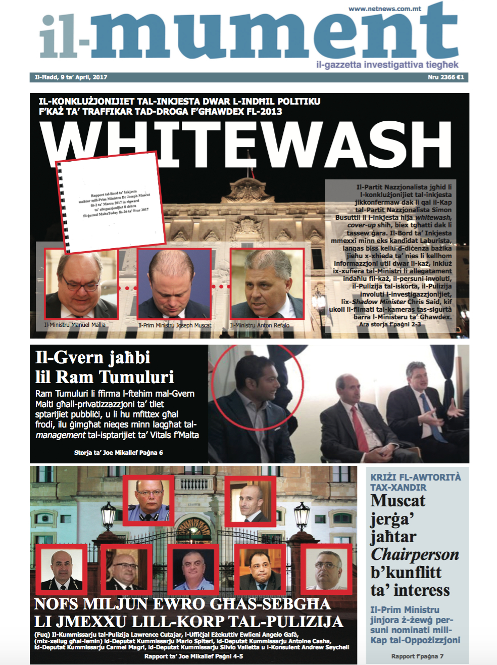Fil-ħarġa tal-lum tal-gazzetta il-mument jispikkaw l-istejjer dwar l-inkjesta dwar il-każ ta’ indħil politiku f’każ ta’ traffikar tad-droga, dwar l-ispiża tal-Korp tal-Pulizija, dwar il-ħatra taċ-Chairperson tal-Awtorita’ tax-Xandir u dwar Ram Tumulari, in-negozjant li xtara l-isptarijiet f’Malta u Għawdex.
