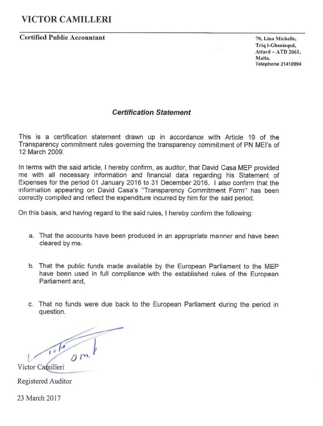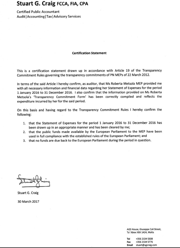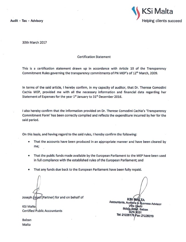 Il-Membri Parlamentari Ewropej eletti f’isem il-Partit Nazzjonalista huma marbuta b’impenn ta’ trasparenza. Il-fondi allokati lill-MEPs tal-Partit Nazzjonalista huma dikarjati, awditjati u pubblikati. Dan hu proċess rigoruż. Ma’ din l-istqarrija qed jiġu ppubblikati Certification Statement li huma prova mill-aktar qawwija tal-gidba ta’ Joseph Muscat.