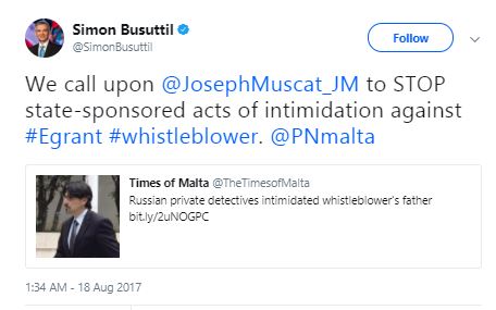 Fi tweet il-Kap tal-Partit Nazzjonalista Simon Busuttil sfida lil Joseph Muscat biex iwaqqaf l-intimidazzjoni kontra l-whistleblower ta’ Egrant.