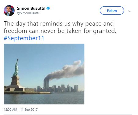 Il-Kap tal-PN Simon Busuttil fi tweet fl-okkażjoni tas-16-il anniversarju qal li din il-ġurnata tfakkarna li l-paċi u l-liberta’ qatt m’għandhom jittieħdu bħala garanzija u li mhux se jintilfu.