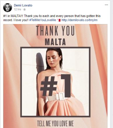 L-artista internazzjonali Demi Lovato bħalissa qed tkompli tikseb aktar suċċessi, l-aktar bl-aħħar album tagħha ‘Tell Me you Love Me’. Il-Kanzunetta li ġġib l-istess isem tal-album bħalissa tinsab fil-quċċata fuq iTunes f’40 pajjiż madwar id-dinja, fosthom f’Malta. Għaldaqstant l-artista għażlet li fuq facebook tirringrazzja lil Malta.