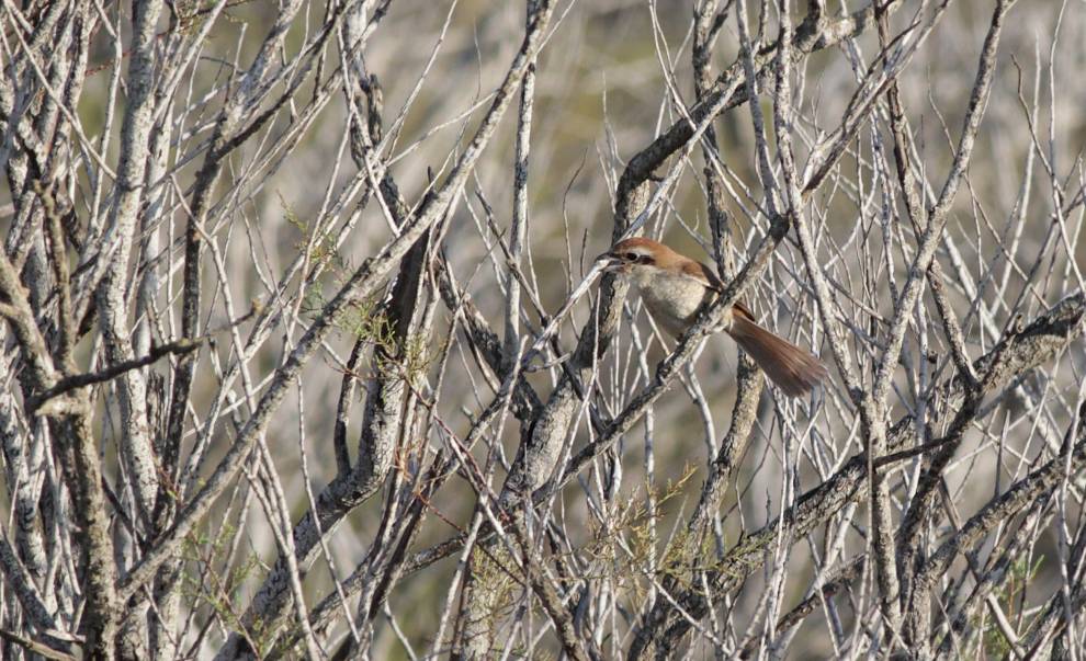 Brown Shrike għandu bħal maskla sewda madwar għajnejh. Bħal dan iż-żmien tas-sena, dan l-għasfur ikun qed ipassi lejn l-Asja, fejn dan l-ispeċi tnissel f’temperaturi ideali għalih.