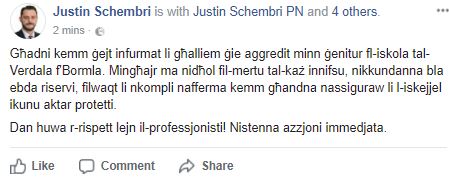 Il-każ kien żvelat mill-kandidat tal-Partit Nazzjonalista Justin Schembri fuq facebook, li wkoll ikkundanna mmedjatament dan l-attakk fuq għalliem.
