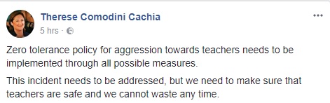 Anke s-Shadow Minister għall-Edukazzjoni Therese Comodini Cachia f’kumment fuq facebook sostniet li quddiem dan il-każ aktar minn qatt qabel għandu jkun hemm tolleranza zero għal kull forma ta’ agressjoni fil-konfront tal-għalliema.