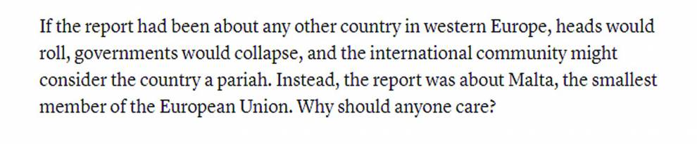 “If the report had been about any other country in western Europe, heads would roll, governments would collapse and the international community might consider the country a pariah (pajjiż iżolat fil-komunità internazzjonali). Instead, the report was about Malta, the smallest member of the European Union. Why should anyone care?”