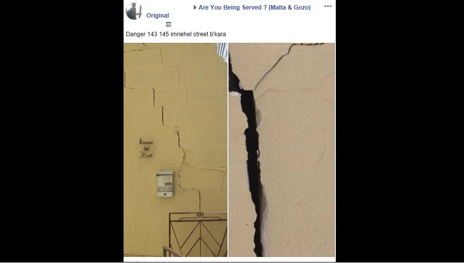 Fuq il-paġna ‘Are You Being Served’ fuq Facebook, persuna tellgħet żewġ ritratti ta’ faċċati ta’ residenzi f’Birkirkara li evidentalment jinsabu f’riskju minħabba l-qsim li qed jidher fil-ġebla. Fuq din il-‘post’ kienu bosta l-kummenti tan-nies li wrew tħassib dwar dak li raw. Din ir-residenza li tinsab f’periklu qiegħda ftit ‘l isfel minn Triq l-Imrieħel, f’Birkirkara.