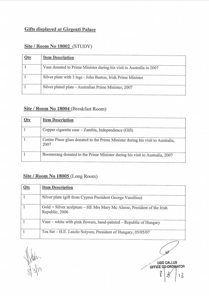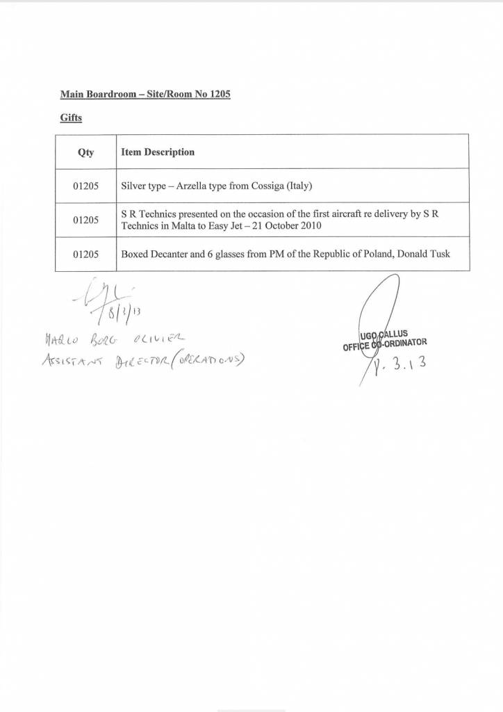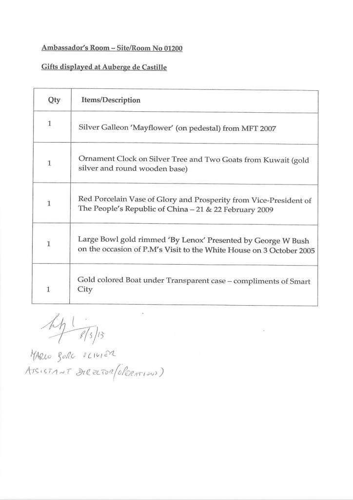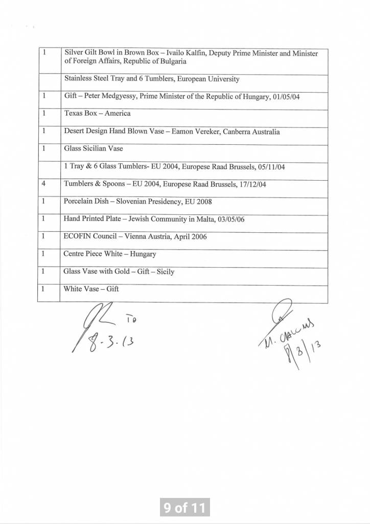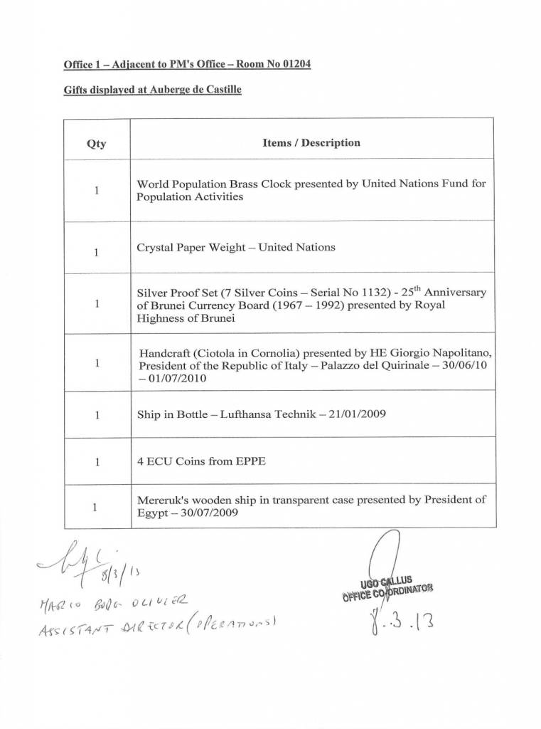 Id-dokument huwa wieħed uffiċjali u huwa datat nhar it-8 ta’ Marzu 2013 – jumejn biss qabel l-elezzjoni tal-istess sena. Iżda skont Muscat, jumejn wara, hu ma sab xejn minn dawn. Aktar minn hekk, hu qal li ma kienx hemm handover ta’ rigali lill-istat. Xi ħaġa li dan id-dokument igiddeb bl-aktar mod ċar, iswed fuq l-abjad.