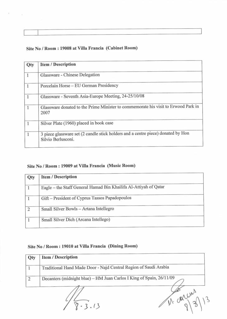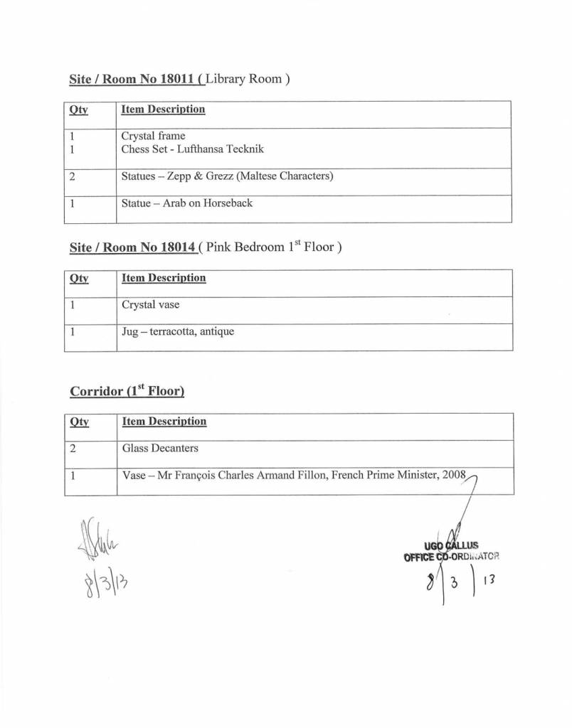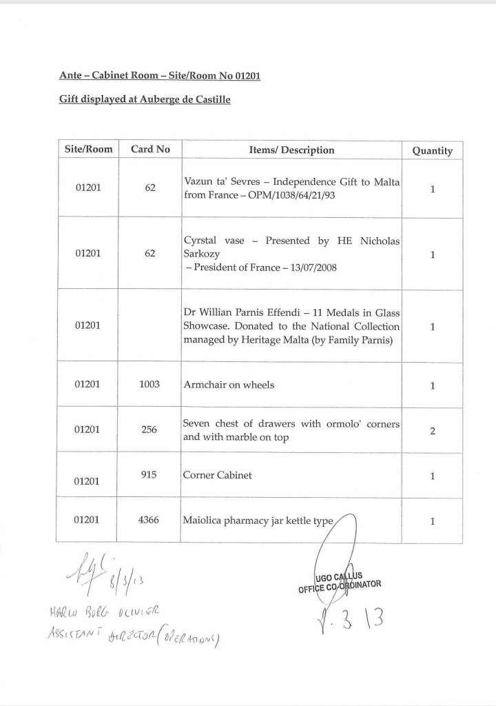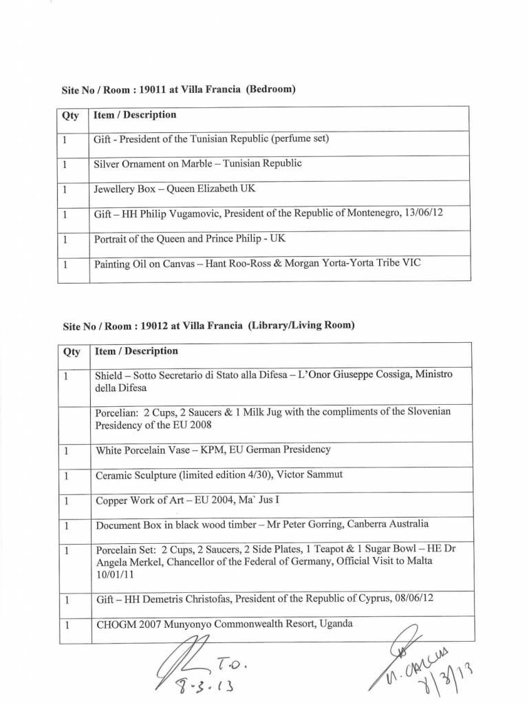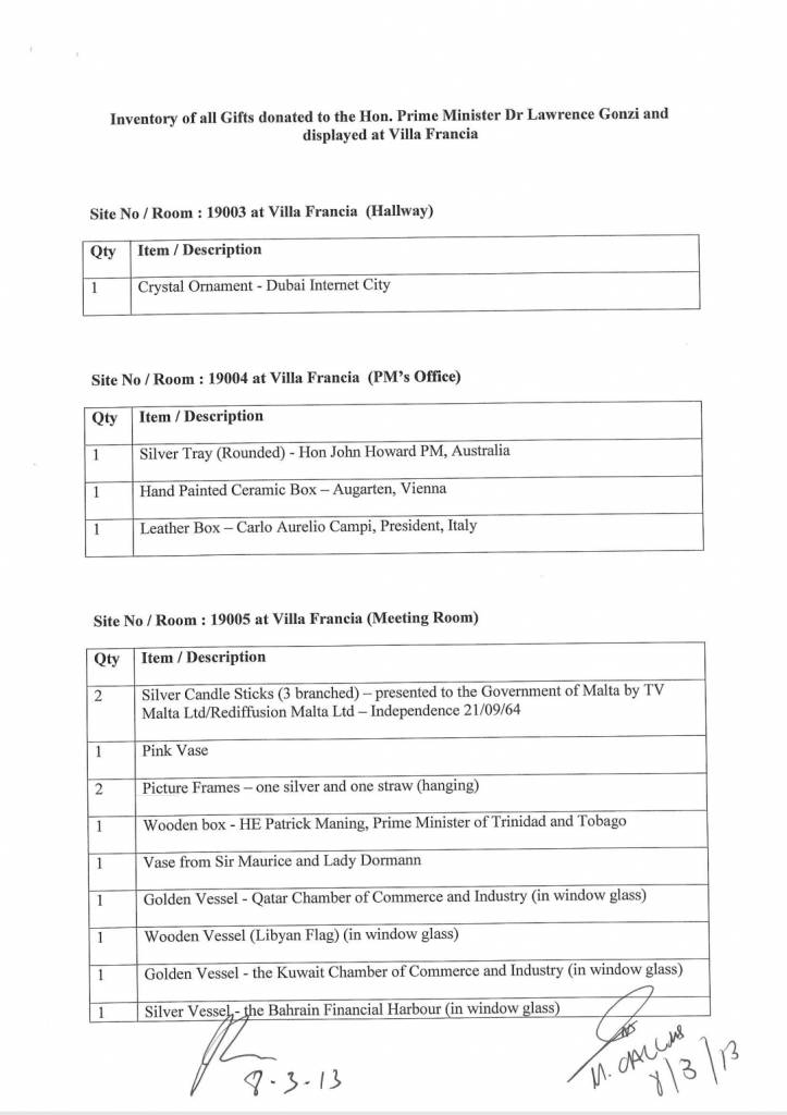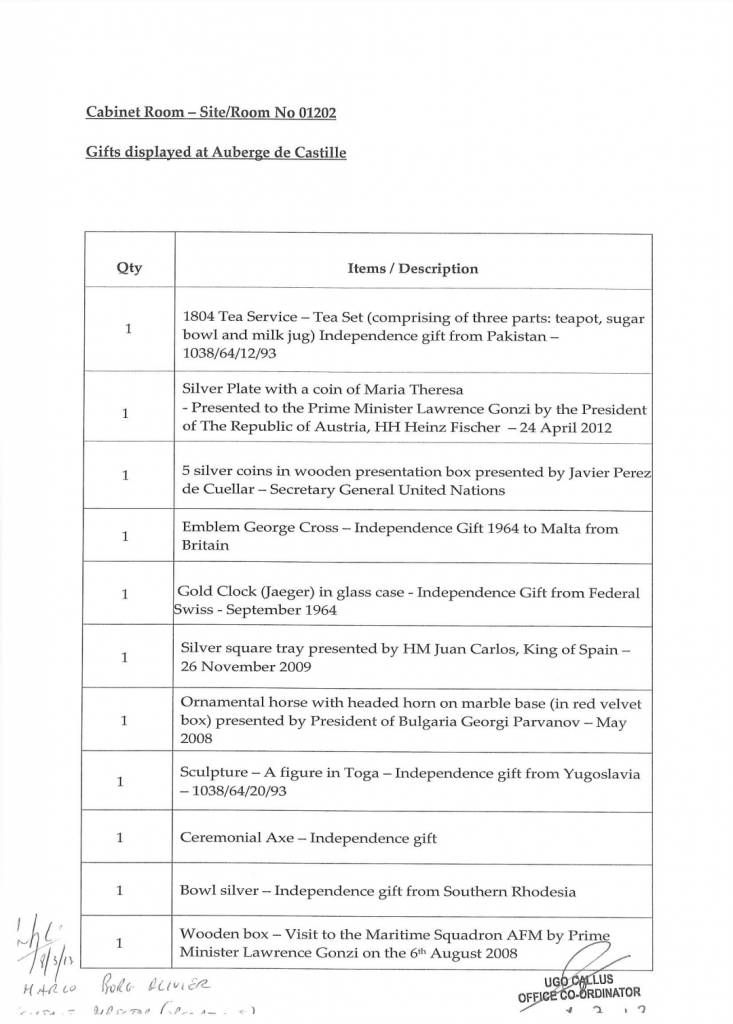 Dan id-dokument, li fih 11-il paġna, jelenka lista ta’ rigali u jindika wkoll eżatt il-post fejn tħallew f’dawn it-tlett binjiet li jintużaw mill-Prim Ministru u minn martu Michelle Muscat, mill-aħħar amministrazzjoni Nazzjonalista fl-2013.