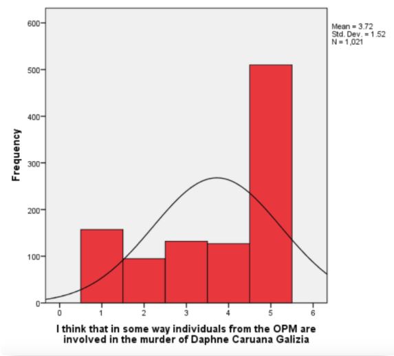Meta l-parteċipanti kienu mistoqsija jaħsbux li membri mill-Uffiċċju tal-Prim Ministru humiex involuti fil-qtil tal-ġurnalista, 62.4% saħqu li huma konvinti li l-OPM huwa nvolut – fejn ankè partitarji Laburisti esprimew din il-possibilità reali ħafna.