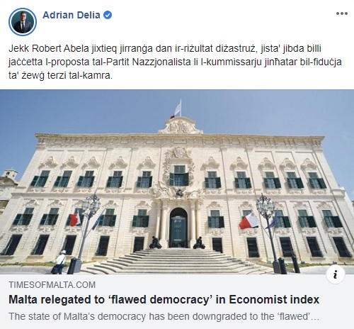Adrian Delia kien qed jirreferi għar-riżultat li ħareġ mill-aħħar edizzjoni tal-Indiċi Dinji tad-Demokrazija miġbur mill-Economist Intelligence Unit fejn pajjiżna m’għadux meqjus bħala demokrazija sħiħa.