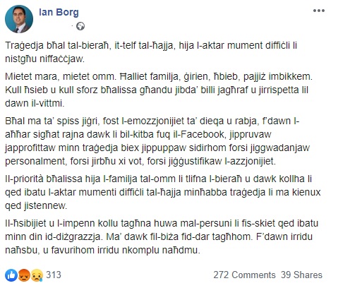 B’reazzjoni għat-treġedja tat-tnejn filgħaxija, il-Ministru Ian Borg kiteb status fuq Facebook li xejn ma niżel tajjeb ma dawrk li qrawh kif jixhdu numru kbir ta’ kummenti.
