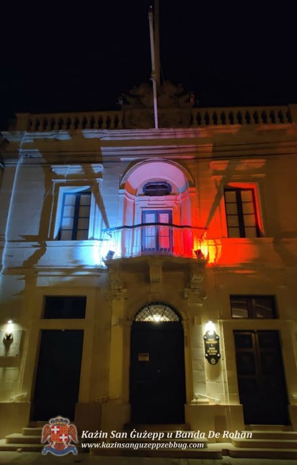 Il-kuluri tal-bandiera Maltija dawwlu l-faċċata tal-Każin San Ġużepp u Banda De Rohan bħala turija ta’ tislima u ringrazzjament lill-impjegati kollha fis-settur mediku kif ukoll dawk il-ħaddiema fil-qasam tas-sigurtà nazzjonali.