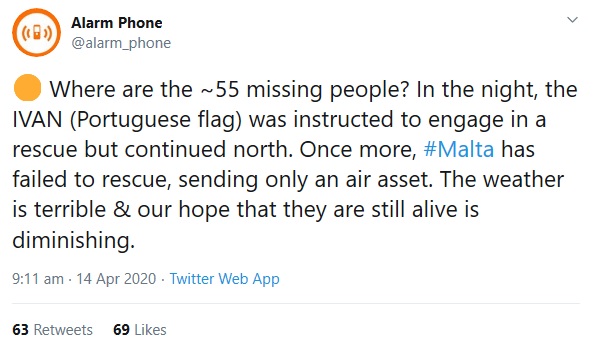 Filwaqt li smajna kif 55 immigrant li kienu bejn sema u ilma intilef il-kuntatt kollu magħhom, l-organizzazzjoni Alarm Phone fuq Twitter akkużat lill-Gvern Malti li naqas milli jagħmel dak kollu possibbli biex isalva ħajjet in-nies.