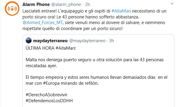 L-istess Alarm Phone, fi tweet separata saħqet li apparti dawn il-55, issa hemm ukoll 43 immigrant li jridu jidħlu f’port sigur. Alarm phone appellat lill-Gvern Malti biex iħallihom jidħlu għax dawn ilhom issofru.