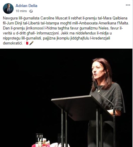 F’post fuq il-media soċjali, il-Kap tal-Partit Nazzjonalista Adrian Delia awgura lill-ġurnalista Caroline Muscat li rebħet il-premju tal-Mara Qalbiena fil-Jum Dinji tal-Libertà tal-Istampa mogħti mill-Ambaxxata Amerikana f’Malta.
