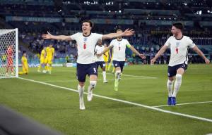 epa09321320 Harry Maguire (L) of England celebrates after scoring his team's second goal during the UEFA EURO 2020 quarter final match between Ukraine and England in Rome, Italy, 03 July 2021. EPA-EFE/Alessandra Tarantino / POOL (RESTRICTIONS: For editorial news reporting purposes only. Images must appear as still images and must not emulate match action video footage. Photographs published in online publications shall have an interval of at least 20 seconds between the posting.)