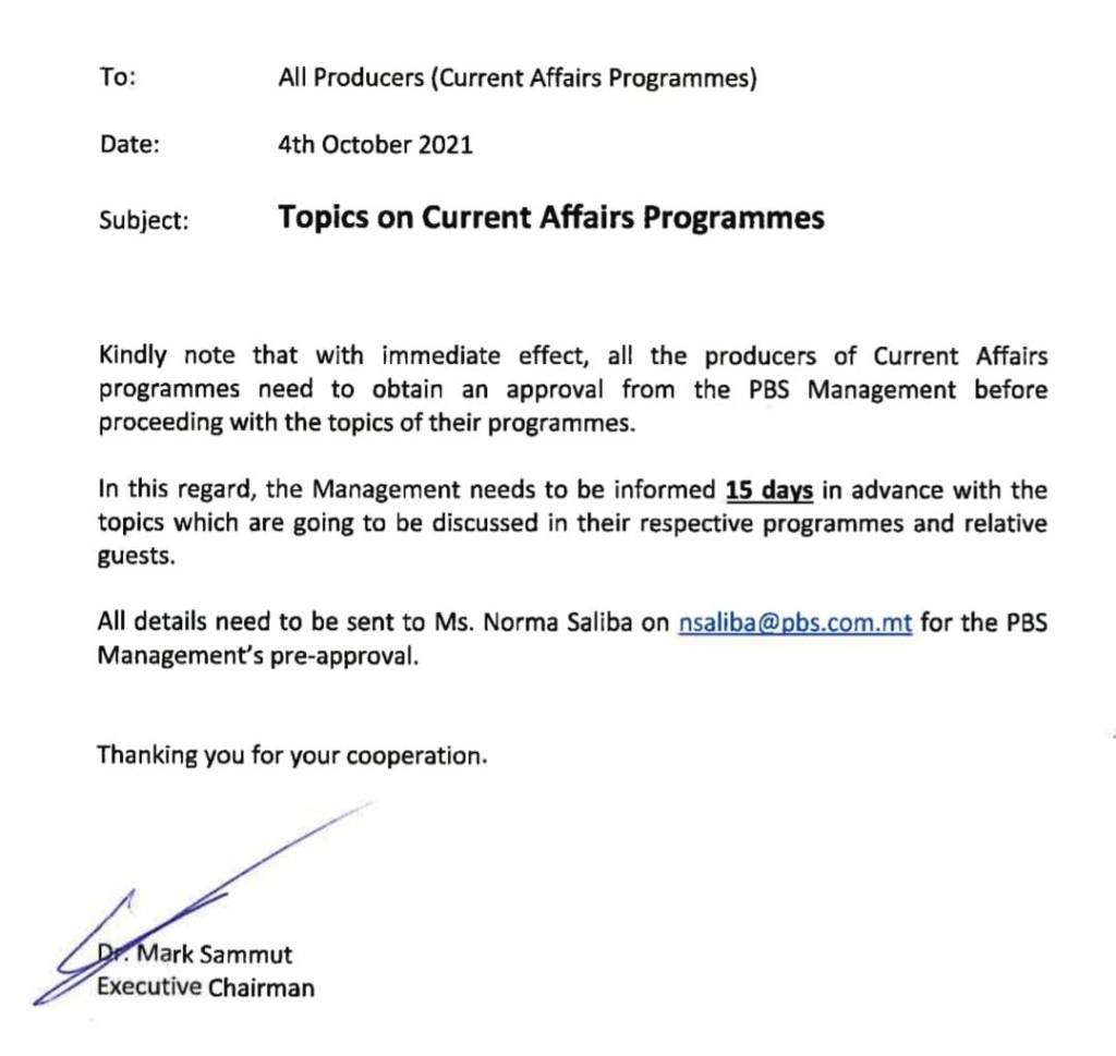 Dan wara li ċ-Chairman tax-Xandir tal-Istat Mark Sammut informa lill-producers li qabel ma jfasslu l-programm għandhom jinfurmaw lit-tmexxija..b’effett immedjat.