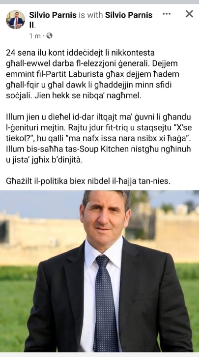 Dan hekk kif fuq il-midja soċjali Parnis, li fl-eqqel tal-pandemija kien ta’ biċċa kejk lir-residenti fid-Djar tal-Anzjani biex jagħmlu kuraġġ, saħaq li dejjem emmen fil-Partit Laburista għaliex dejjem ħadem biex jgħin il-fqir. Prontament, saħaq li ltaqa’ ma’ ġuvni hu staqsieh x’kien se jiekol…biż-żgħażugħ jgħidlu ma kienx jaf.