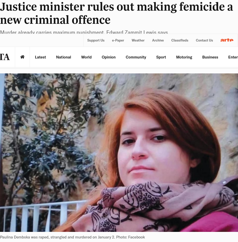 Kien l-ex Ministru tal-Ġustizzja Edward Zammit Lewis li f’Jannar 2022 kien iddikjara li ma kienx possibbli li l-femiċidu jsir reat għaliex il-liġi kriminali kienet diġà taħseb biex tagħti l-piena massima ta’ ħabs fil-konfront ta’ qtil; dik ta’ għomor il-ħabs. Din id-dikjarazzjoni kienet saret propju f-isfond tal-qtil tal-Pollakka Paulina Dembska li kienet inqatlet f’Tas-Sliema fit-2 ta’ Jannar 2020 fi Ġnien l-Indipendenza.