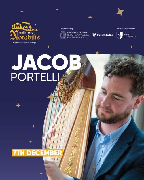 Kunċert fuq l-Arpa minn Jacob Portelli se jkun qed jittella’ waqt l-attivita tant popolari Natali Notabilis li qed tittella’ fit-toroq tar-Rabat sal-15 ta’ Diċembru 2024.