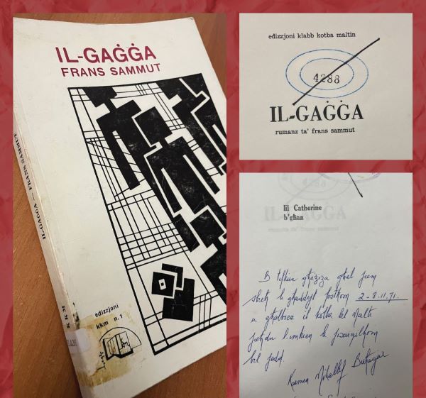 Għadhom kif qaluli li minn skola partikolari rmew għadd ta’ kotba, fosthom ktieb (l-ewwel edizzjoni) ta’ missieri, Il-Gaġġa, iffirmat b’dedika mill-isbaħ minn Karmen Mikallef Buħaġar.
