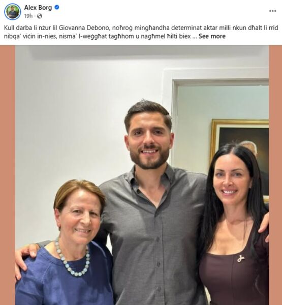Kien dan kliem il-Kap tal-Partit Nazzjonalista Alex Borg, li permezz ta’ post fuq il-midja soċjali tiegħu spjega li kull meta jmur jitkellem u jisma’ lill-eks Ministru Nazzjonalista Giovanna Debono huwa joħroġ aktar determinat li jiżgura li ċ-ċittadini tagħna jilħqu l-aspirazzjonijiet li għadhom f’ħajjithom.