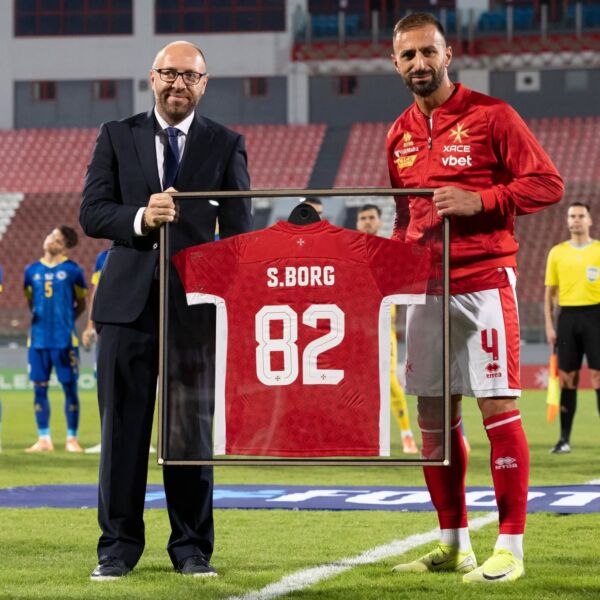 Qabel il-partita, il-President Bjorn Vassallo ippreżenta flok bin-numru 82 lil Borg, bħala ringrazzjament għall-impenn u l-kontribut li d-difensur ċentrali ta lit-tim nazzjonali Malti f’karriera ta’ aktar minn 14-il sena.