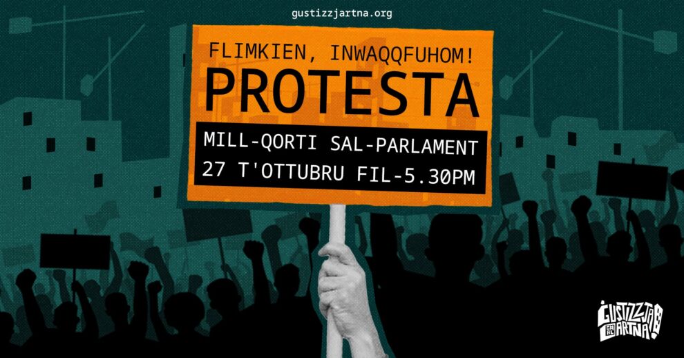 Hekk kif il-Gvern qed ikompli jippersisti biex jibqa’ għaddej bil-liġijiet tal-ippjanar qerrieda li se jixħtu s-setgħa kollha f’idejn l-iżviluppaturi, il-kampanja Ġustizzja għal Artna qed issejjaħ lin-nies biex jerġgħu jingħaqdu fi protesta t-Tnejn, is-27 ta’ Ottubru. Il-protesta se tibda fil-5:30pm minn quddiem il-Qorti u tibqa’ miexja lejn il-Parlament.