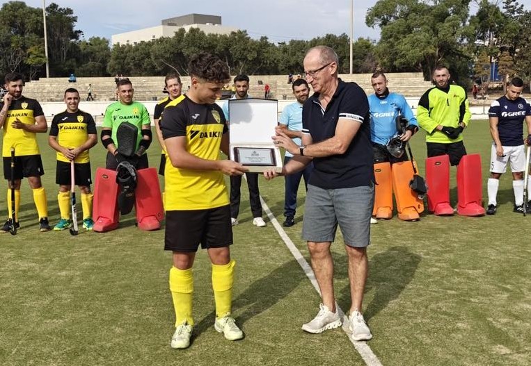 Il-President tal-Malta Hockey Association David Agius ippreżenta l-unur ta’ Plejer tas-Sena 2024-25 lill-istess Luke Bajada.