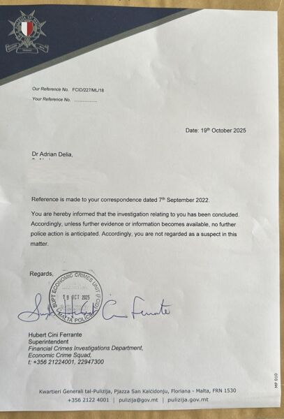 Uffiċjal għoli tal-pulizija mill-iskwadra li tinvestiga l-Kriminalità Finanzjarja, f’ittra uffiċjal, avża lill-Membru Parlamentari tal-PN li l-investigazzjoni fuqu ġiet konkluża.