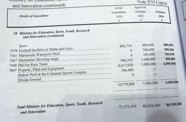 Fl-2024, l-ispiża tal-Gvern fl-isport kienet aktar minn €10,700,000 – bl-ispiża tonqos għal €7,400,000 fl-2025 u issa, l-estimi għal 2026 qed juru li n-nefqa se tkun dik ta’ €6,000,000. Tnaqqis ta’ fondi allokati f’dan il-qasam b’aktar minn 4 miljun ewro f’temp ta’ sentejn.