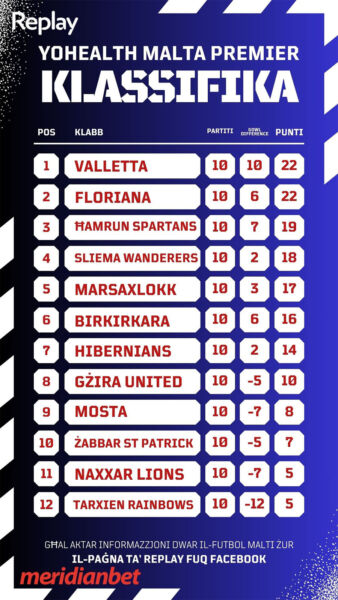 Il-klassifika attwali tal-Malta Premier wara li kull tim lagħab għaxar partiti mill-bidu tal-Kampjonat
