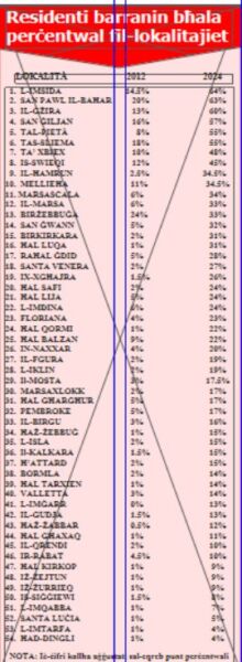 Ma’ dan l-artiklu qed nippubblika lista ta’ kif il-lokalitajiet Maltin (dawk ta’ Għawdex f’artiklu separat) KOLLHA kellhom żidiet fin-numru ta’ residenti barranin li wħud minnhom jistgħu jissejħu enormi.