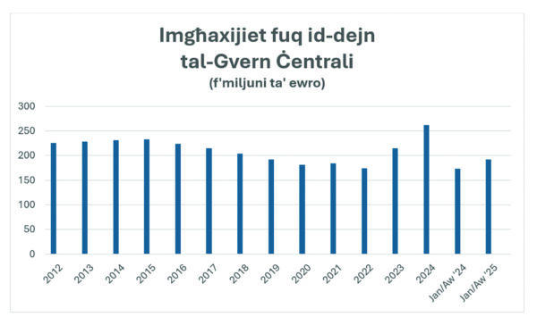 F’Malta, il-Gvern beda jissellef b’4.00 fil-mija, b’4.65 fil-mija, bil-5.20 fil-mija. Dan is-self kabbar in-nefqa fuq imgħaxijiet. Nefqa li minn €173.6 miljun fl-2022 telgħet għal €214.3 miljun fl-2023 u €261.4 fl-2024. Fl-ewwel disa’ xhur ta’ din is-sena, in-nefqa f’imgħaxijiet kienet ta’ €221.5 miljun meta fl-istess perjodu tas-sena l-oħra kienet €194.3 miljun. Li jfisser li l-Gvern ħareġ €27.2 miljun, jew 14 fil-mija iktar f’imgħaxijiet.