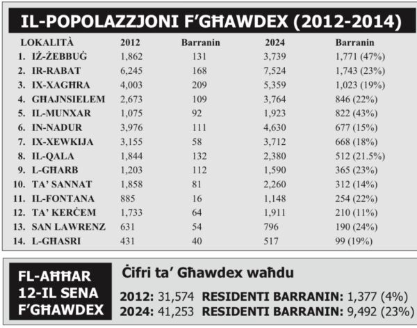Aktar indikattiv hu l-fatt li f’dawn it-12-il sena (2012-2024), ir-residenti barranin f’Għawdex żdiedu bi 8,105 – medja ta’ aktar minn 600 fis-sena.