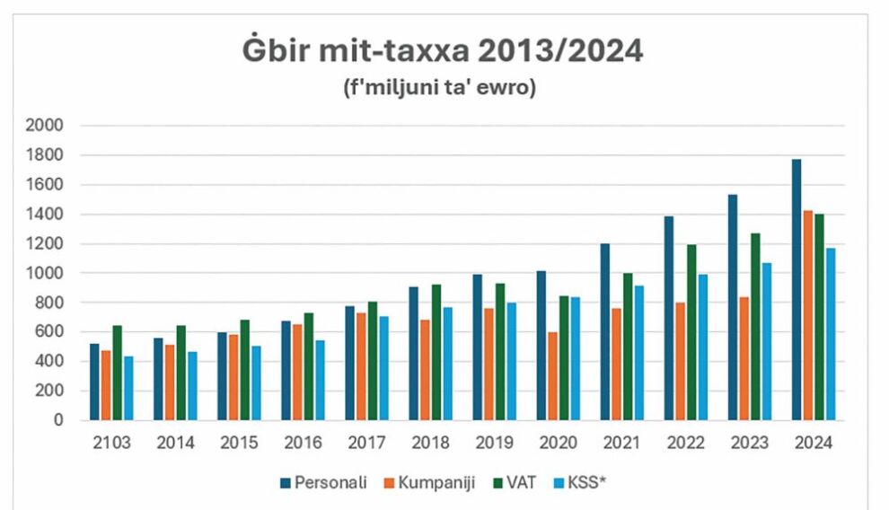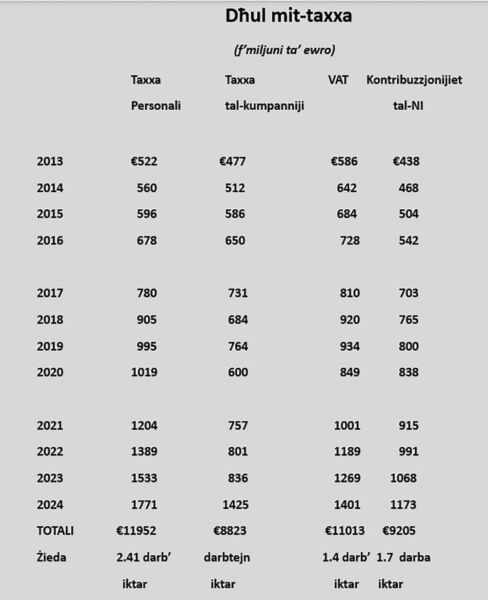 Mela jekk ngħoddu kemm-il darba żdied iktar id-dħul mit-taxxa personali, id-dħul mill-VAT u d-dħul mill-kontribuzzjonijiet tas-Sigurtà Soċjali nsibu li l-piż minn dawn it-tliet taxxi fl-2024 kien ħames darbiet iktar.